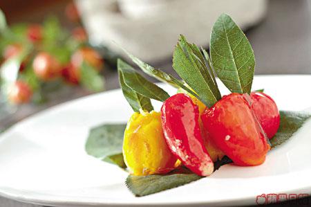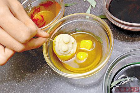 2.綠豆茸搓至喜愛形狀,用牙籤穿起,再掃上色素,浸在魚膠粉溶液內鎖色,最後拔出牙籤即成。