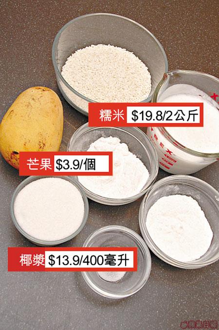 3.芒果𠝹花後,伴在糯米飯旁,淋上餘下椰漿即成。