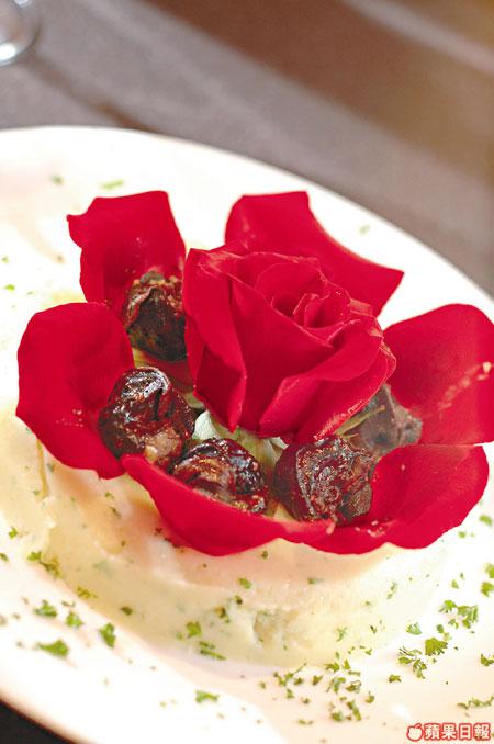 3.玫瑰花取下花瓣排在薯茸上,再放蝸牛肉即可。