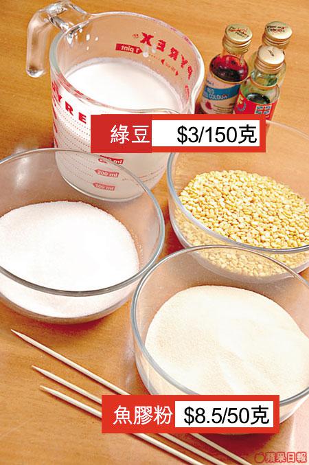 糖及魚膠粉各150克、綠豆及水各300克、椰漿350毫升、食用色素少許