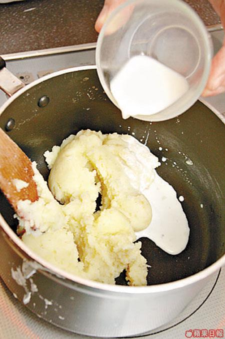 1.薯仔煮熟壓成茸,放入已煮溶的牛油,加入牛奶及其他薯茸調味料拌勻至滑身,置在碟中央。
