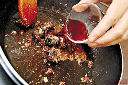 2.以蒜茸、辣椒膏及沙茶醬等起鑊,放入蝸牛肉,加入其他調味及紅酒燴至汁料乾身。