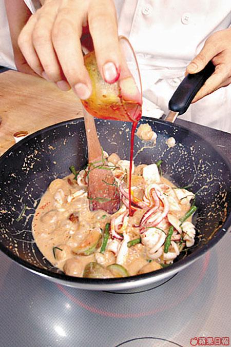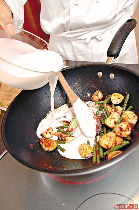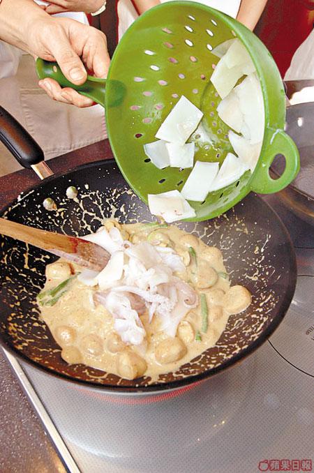 2.爆香馬沙曼咖喱醬及茄子,加入椰漿煮滾。先後再加鮮魷魚、豆角、草菇同煮。