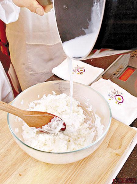2.椰漿分成4份,1份留起,3份則倒進蒸好的糯米內拌勻,讓糯米把椰漿完全吸收。
