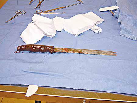 勞德代爾堡居民斯卡羅拉發現六個月大的「埃莉斯」連續幾天神情沮喪,上周二更伏在㕑房地上,發抖不已,於是送牠看獸醫,豈料X光片竟顯示牠體內有一柄十三吋長的有鋸齒利刀,但卻沒有傷及內臟,獸醫也覺得難以置信。