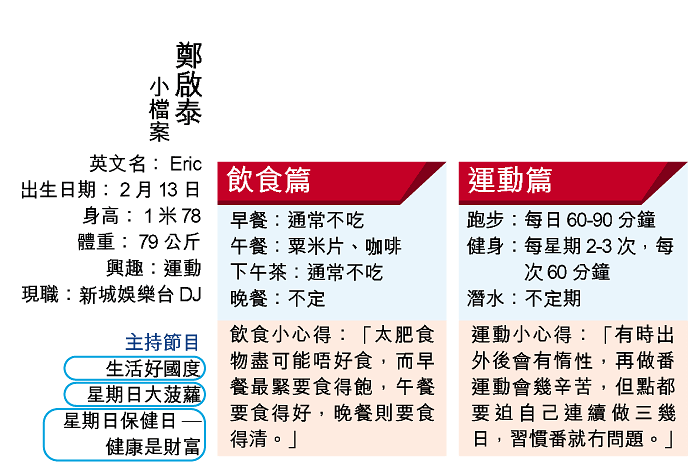 很難想像現在身形相當標準的新城DJ鄭啟泰(Eric)曾經是重達二百三十磅的「大肥仔」,不過,當他發現身體愈來愈多小毛病,又難以買褲之際,便下定決心,透過做運動及控制飲食。經過半年努力的減肥行動,成功減去七十磅;而更重要的是自此養成做運動的習慣,現在運動已成了他生活其中一部份。