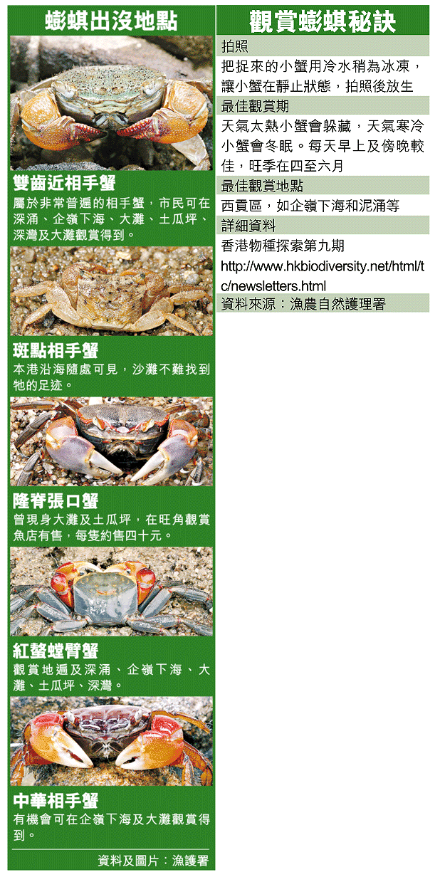 【本報訊】到郊外海邊摸蜆捉蟹仔,已成為假日親子活動之一。漁農自然護理署海岸生態工作小組發現,本港沿岸約有十七種俗稱「蟛蜞」、體形細小的相手蟹。該署指出,市民只要有耐性,在不同地點,不難觀賞到色彩繽紛的不同品種相手蟹,但觀賞之餘,不應把蟹仔帶回家飼養,免蟹仔不能適應而死亡。 記者:林社炳