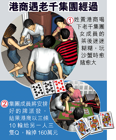 【本報訊】深圳消息:一幫有港人參與設局誘賭的「老千集團」早前遭公安偵破,受害人包括港商和內地高級職員,他們玩撲克「沙蟹」時均是手拿三條10輸給三隻Q,其中一名港商輸掉一百六十萬元。集團行騙歷時一年多,涉及騙款六百萬元,案中有三名疑犯落網和被起訴,包括涉案一名港人,公安仍在緝捕主腦歸案。