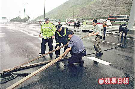 【本報訊】受颱風達維影響,大嶼山一條橫跨竹篙灣公路及欣澳道的架空電話線,昨晨十時許被強風吹跌打中駛經旅遊巴的倒後鏡,幸無人受傷。電話線橫亘十一條行車線,警方一度懷疑是電纜,將來往迪士尼樂園的行車線全線封閉,遊客需要到欣澳站轉乘地鐵;及後證實是電話線,擾攘兩小時由電話公司職員將它剪斷撿走,行車全面恢復正常。電訊盈科發言人事後表示,該條電話線只是備用,對所有電話服務並無影響。