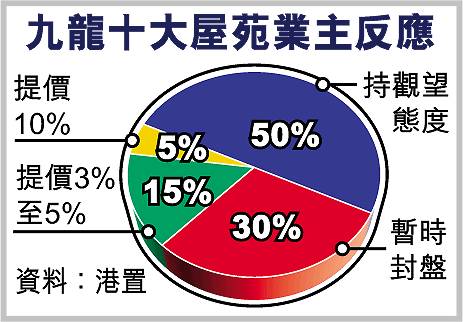 【本報訊】香港置業於賣地前向東九龍及西九龍十大屋苑273名小業主進行的調查顯示,有三成被訪者看好後市而暫時封盤,有5%被訪者會將單位叫價提高10%,另有15%被訪者有意調高叫價3至5%,但一半被訪者仍持觀望態度。