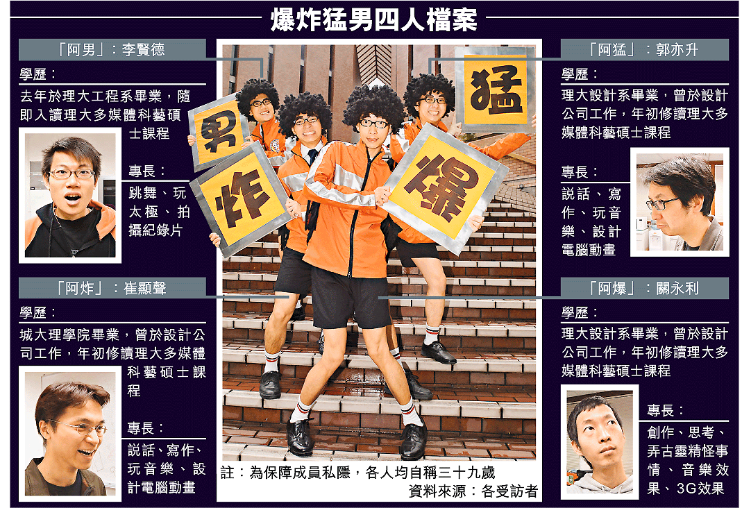 【本報訊】四名不願透露年齡的碩士生,為體驗娛人自娛的滋味及吸取電視台製作經驗,不惜剃頭、以眉筆畫上四吋粗的濃眉、穿上短褲和鮮橙色制服,以及戴上爆炸頭型假髮,以「騎呢」形象參加電視台表現比賽節目《殘酷一叮》,為港人帶來不少歡樂。這四名來自香港理工大學多媒體科藝課程的碩士生,更計劃以「爆炸猛男PHD」的稱號,將笑彈擲入校園,讓學生明白甚麼是創作。 記者:梁美寶、蔡元貴