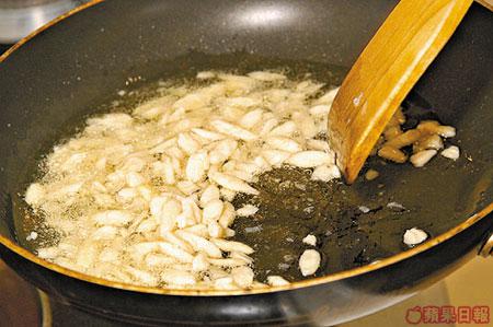 炸欖仁要見油燒至少許冒煙,才加入欖仁轉慢火炸至金黃。