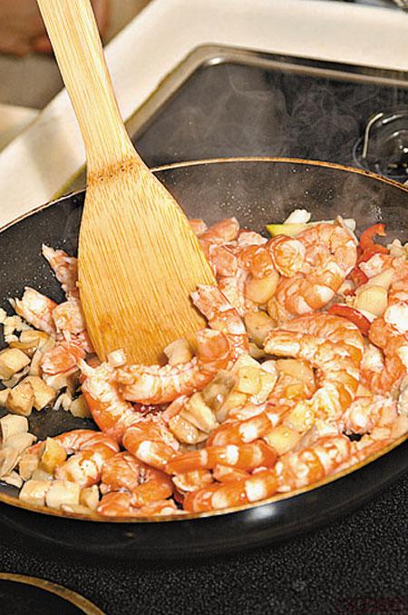 最怕吃那些以泡打粉醃過的蝦,肉質彈牙卻毫無味道。唯靈則會先把蝦原隻灼熟再炒,令蝦仁彈牙爽口,還可免走油或汆水時蝦仁縮水。碟底鋪上粟米片,加欖仁脆上加脆。