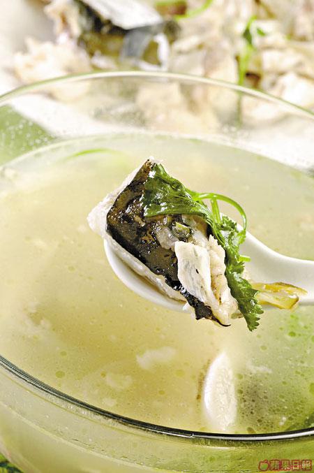 皮蛋芫荽魚片湯可清熱氣,而此湯本也用鯇魚片以滾水淥熟而成,但免擔心魚片滾得不夠熟有寄生蟲,改以鱅頭(即大魚魚頭)與魚尾同煮,上桌時,將湯渣撈起,跟熟油、生抽及胡椒粉等伴食。