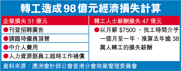 企業流失員工導致龐大損失,轉工的打工仔損失亦大。龐柏智說,打工仔一般需要一個月至一年不等,才能找到另一份工作。以他們七千五百元月薪計算,估計去年轉工的打工仔薪酬損失,亦高達四十七億元。