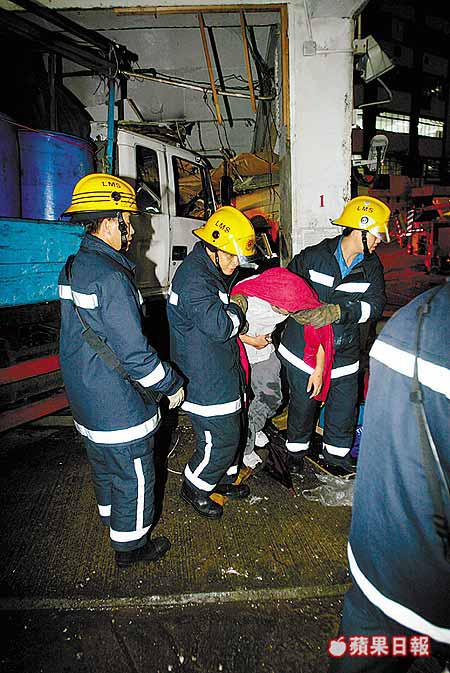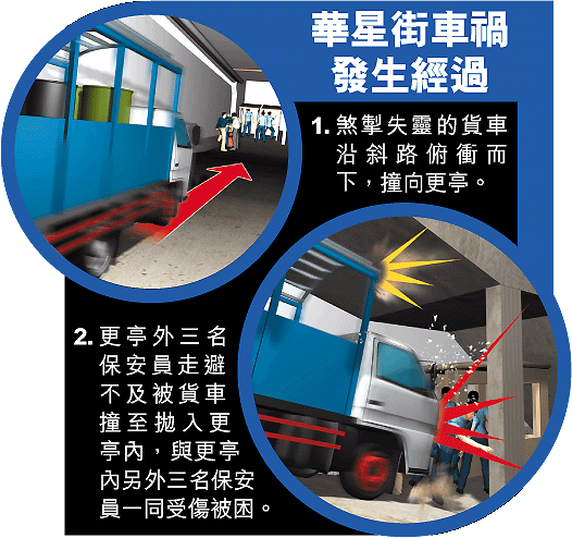 【本報訊】葵涌華星街一幢工業大廈昨傍晚發生嚴重車禍,一輛二十四噸重貨車懷疑煞掣失靈,從大廈停車場對開的一條二十米長斜路俯衝而下,直撞向大廈門口一座搭建在樓梯底的看更亭,七名站在更亭內外準備交班的大廈保安員,除一人幸免外,其餘六人均被撞倒及拋入更亭內,肇事貨車的司機及跟車工人被困車中,一名途人被碎片彈中受傷。消防員到場將九名傷者逐一送院,其中兩人傷勢嚴重。有傷者事後表示:「好彩樓梯底嘅橫樑頂住架車,如果唔係實死梗,成個更亭都會被鏟平。」 記者:劉漢權 林榮海