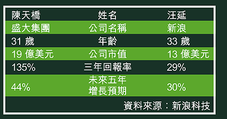 美國華爾街分析員根據財經信息提供商CapitalIQ的數據,選出創業板(Nasdaq)最年輕(三十五歲以下)的五位CEO,當中兩名來自中國的新貴——盛大集團的陳天橋和新浪(Sina)的汪延入選。分析員約翰.利弗斯(JohnReeves)表示,入選的五家公司的市值還不到二十億美元,證明它們仍然有很大的發展空間。
