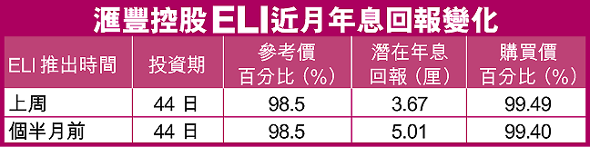 以滙控ELI為例,同為44天投資期,若接貨折讓減至99.2%,年息回報便可提升至5.18厘,較上述ELI98.5%接貨價的息率回報足足增加逾1厘。以滙控現價約125元計,前者接貨價約為124.2元,後者為123.3元,約0.9元的差距不算過大,部份風險更可在息率中被抵銷。