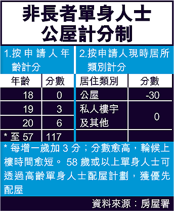 【本報訊】房屋署建議在本周四即時實施計分制,以收緊非長者單身人士申請入住公屋資格。年紀愈小得分也愈少,十八歲年輕申請人更只得零分,可能要輪候長達二十年,才可上樓。房署每年也只會分配一至二千個單位予五十八歲以下的單身申請人,比現時大減。房委會資助房屋小組於本周四會討論有關建議,若通過即時實施。但有房委會委員批評,計分制歧視年輕人。 記者︰馮永堅