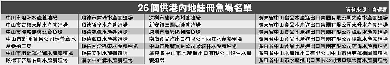 食環署已完成視察內地供港魚場,昨把二十六個供港魚場名單交予業界,由業界安排從這些魚場入口淡水魚。港九新界海外漁業批發商會理事長許漢文說,名單中的大部份魚場位處中山及順德,三個位於深圳;而早前內地公布的十八個魚場,只有四個仍在名單之內。