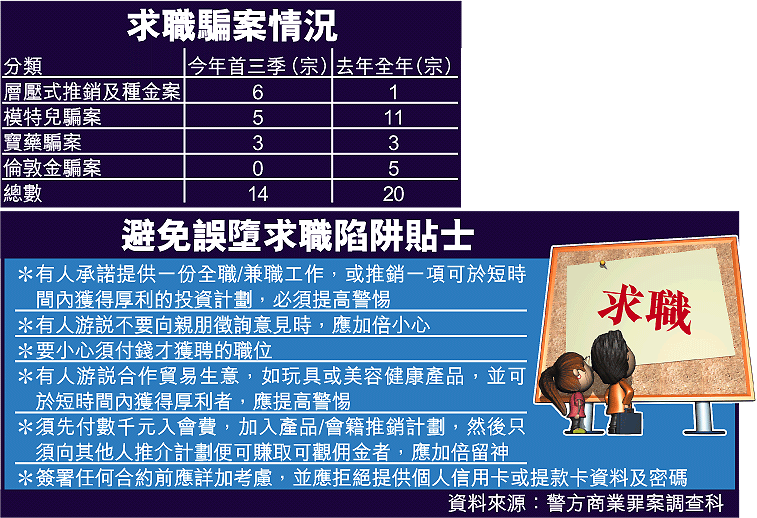 【本報訊】警方今年首三季接獲的求職騙案共有十四宗,涉款近五千萬元,與去年相若,但當中懷疑層壓式推銷騙案卻大幅上升,今年首三季便已有六宗,去年全年則只有一宗,警方預期若就業情況持續理想,求職騙案會進一步下跌。 記者:謝明明