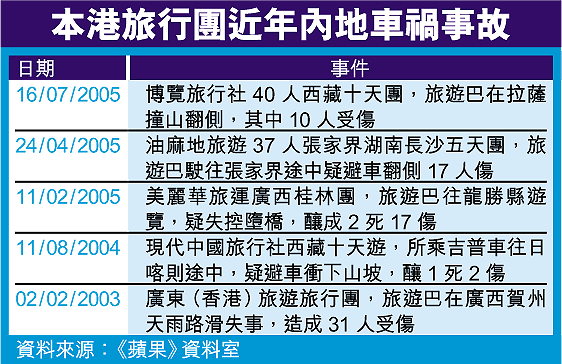 【本報訊】廣東省深汕公路○二年大年初一發生嚴重車禍,三十名參加潮汕旅行團的本港市民,因旅遊巴翻車,釀成三死二十七人受傷慘劇。其中一對團友夫婦頭部重傷,女方喪失嗅覺,男方因一度昏迷,影響記憶和語言能力,並須依靠枴杖扶行,另一名受傷女團友更在車禍中痛失十二歲愛兒,致精神受創,三名團友向旅行社索償合共五百三十五萬元,案件昨在高等法院開審。 記者:陳詠詩