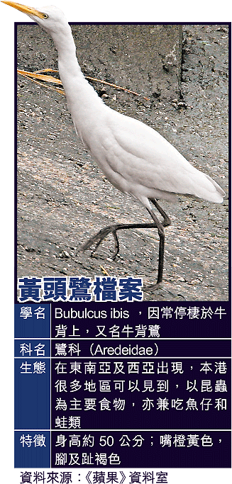黃頭鷺在本港很多地方都可見到,如元朗、新界邊區、大埔等,牠們喜群居,以昆蟲為主要食物,亦兼吃魚仔和蛙類,因常停棲於牛背上,故俗稱為牛背鷺。