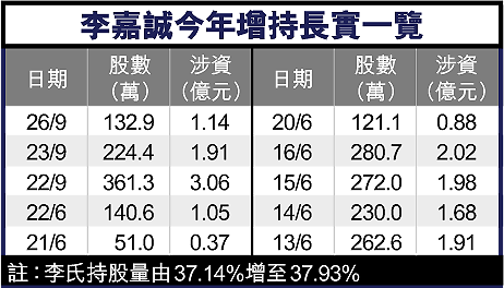 李氏於今年6月也7次增持合共1358萬股長實,涉資近10億元,平均每股買入價72.78元,受李氏增持刺激,長實股價由6月初約71元,升至6月27日的76.5元,其後長實股價繼續有支持,8月份更升至88.7元高位。