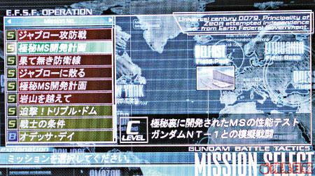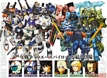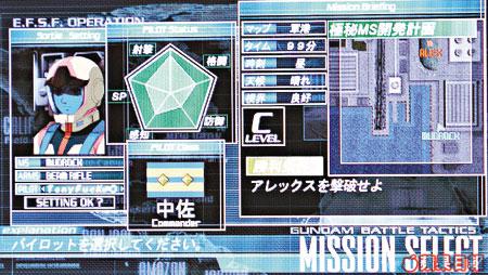 基本一開始遊戲,玩家必須要用自創角色(有男?女可選)開始,由於開初只是一名小兵,各樣能力值都唔高,能選機體亦只有吉姆同渣古等「二打六」MS,感覺真係幾難打吓,隨住遊戲發展,經過一場又一場戰役,角色的各樣能力值同官階會不斷跳升,而且中間重會有著名的機師如亞寶及馬沙等出現,俾大家選用!