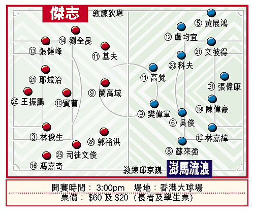 暫排香港甲組聯賽頭位的傑志,今午三時在香港大球場上演的甲組足球聯賽「榜首大戰」,乘勝以強陣狙擊澎馬流浪,希望能取得三連捷。