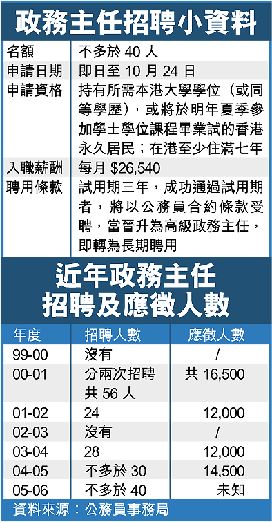 政府為了於○六至○七年度將公務員編制減至約十六萬,○三年四月一日起停止招聘公務員,在現有凍結招聘政策下,政務司司長和財政司司長共同擔任主席的委員會負責考慮所有豁免申請,過去兩年政務主任職系都獲得解凍,分別獲准招聘二十八人及不多於三十人,今年則獲批增聘不多於四十名政務主任,不但較過去兩年增加逾三成,也是五年以來的新高。