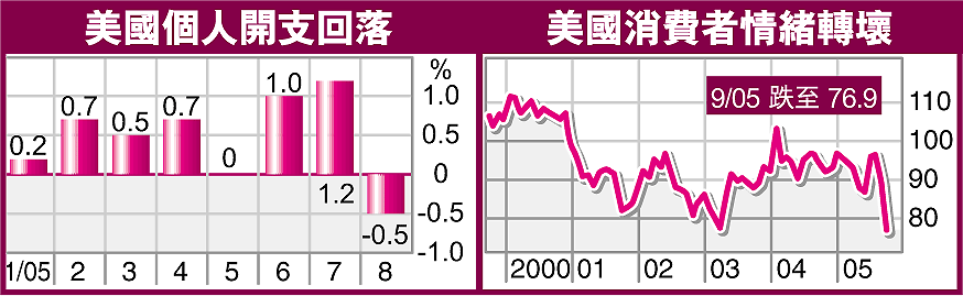 美國8月份個人開支錄得近4年來最大跌幅,主要反映颶風「卡特里娜」導致燃油價格上漲,削弱消費者的消費意欲。不過,芝加哥製造業9月擴張步伐快過預期,反映當地企業能應付颶風「卡特里娜」和「麗塔」引起的高油價影響。
