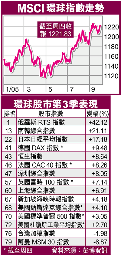 【本報綜合報道】環球股市連跌兩季後,在第3季反彈逾6%,擺脫高油價造成的打擊。新興市場其間的表現優於發展成熟的市場,其中俄羅斯股市升越四成,回報率在全球稱冠。在各成熟市場中,日股跑贏美歐等地,而美國股市僅錄得單位數升幅。