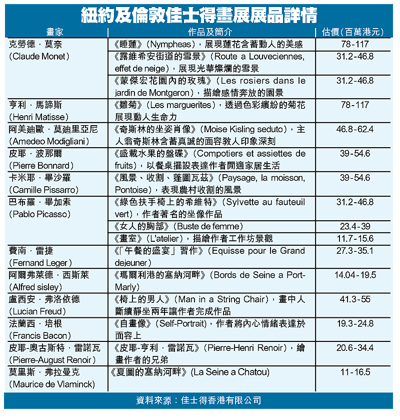 「印象派及現代藝術」畫展展出十六幅畫作,其中十二幅作品下月將在紐約進行的拍賣會中公開拍賣,其餘四幅作品亦會於明年二月在倫敦進行公開競投。展品囊括馬諦斯、莫奈、畢加索及畢沙羅等名畫家的作品,其中以印象派大師莫奈的作品《睡蓮》及馬諦斯的作品《雛菊》最受矚目,兩幅作品的估價分別高達七千八百萬至一億一千七百萬港元。