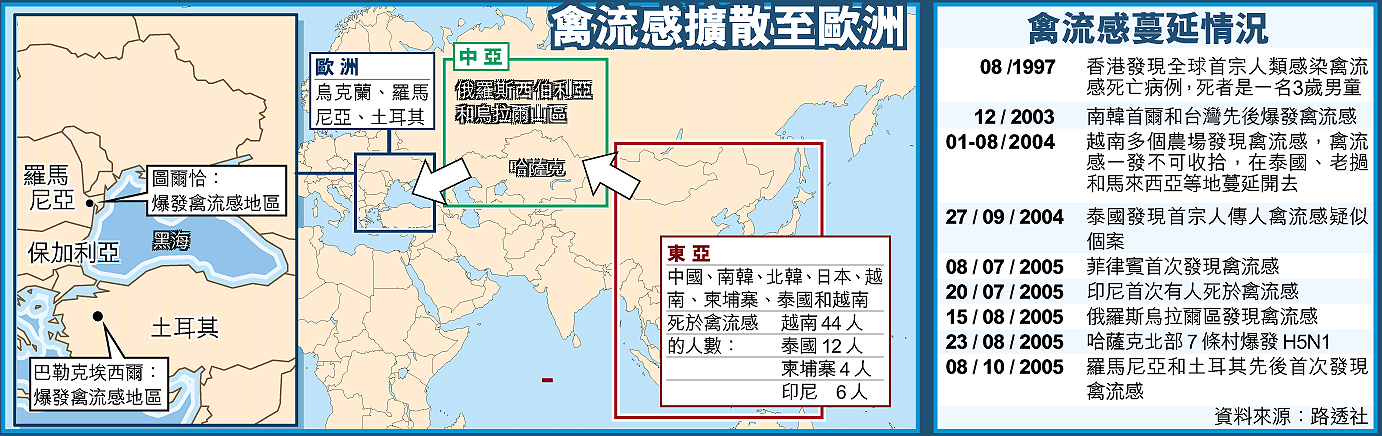禽流感殺入歐洲了。繼在亞洲肆虐奪去至少六十五人性命,以及蔓延至俄羅斯和哈薩克後,禽流感終於跨入歐洲門檻。羅馬尼亞證實三隻家養鴨子死於禽流感之後,土耳其也證實二千隻火雞死於禽流感。西方國家憂慮,禽流感散播到歐洲,一旦變種人傳人,全球將爆發大流感疫。