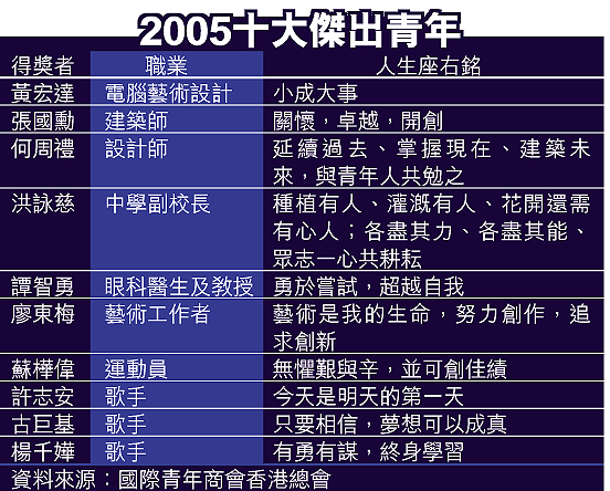 【本報訊】「小成大事,大事係由無數小成累積而成嘅。」獲選為本年度十大傑出青年的電腦技術設計師黃宏達坦言,人生座右銘是珍惜每一件小事的成果。負責《無間道》、《頭文字D》及《童夢奇緣》等電影電腦效果設計的他直言,工作最大滿足感是「將天馬行空意念做得成功、感動到觀眾。」 記者:蔡建豪