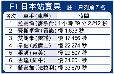 「我與費斯卓拿的距離很接近。」拉高倫說。「在最後一圈的大直道上我終於成功越過他。我們當時很貼近,幸好當時沒有發生任何碰撞。」今年F1最後一站將於本月十六日在上海上演。
