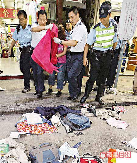 至下午五時,少婦餘怒未消,突然激動起來,在房間打開窗門,將丈夫的衣物,如衫褲鞋襪、背囊、孭袋、書籍及光碟雜物等全掟出街外,甚至將自己的內衣亦拋下街,在十多分鐘內,已有五十多件物件如仙女散花掟下,散滿兩條行車線上。