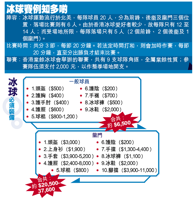 球員每次上陣時通常最多只有兩分鐘,但就讓他們一嘗在冰上「飛」的滋味,更不惜為了「飛」而一擲千金購買裝備。香港業餘冰球會的創辦人之一、前港隊球員潘嘉華,由大專時候用五十元買木棍跟同學打「StreetHockey」,到最後花了四千元添置冰球裝備(見圖)也在所不惜。他說:「在冰上高速滑行,會感覺到『呼呼聲』的風在耳邊飛過,感覺跟開快車沒有兩樣,所以安全的保護裝備一定不可少。」