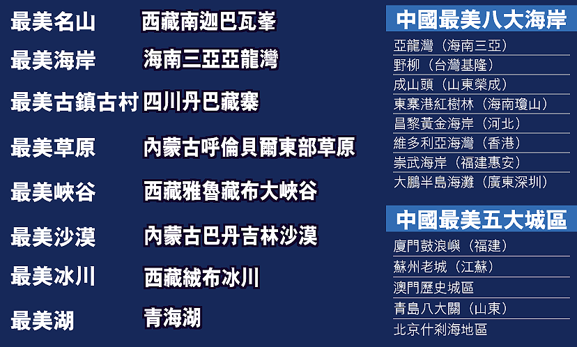 哪裏是全中國最美的地方?在中國的崇山秀水、奇峽美林中,《中國國家地理》選出最美十大名山、最美十大峽谷和最美五大湖等等,榜上有名的除黃山、西湖等成名已久的山水,更多是名不經傳的美景。至於香港近年備受填海威脅的維多利亞海灣,也榮登中國最美八大海岸;剛成為世界文化遺產的澳門歷史城區,則名列中國最美五大城區。