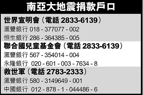 美國則率先捐出十萬美元(約七十八萬港元),總統喬治布殊說這是「可怕的悲劇」,聲言「援助已在途中」。英國亦捐出約一百三十六萬港元、愛爾蘭約九百四十萬港元、德國約四十七萬港元、澳洲約二百九十三萬港元、歐盟約二千八百萬港元、世界銀行約一億五千萬港元。國際慈善組織樂施會也全力募捐賑災。