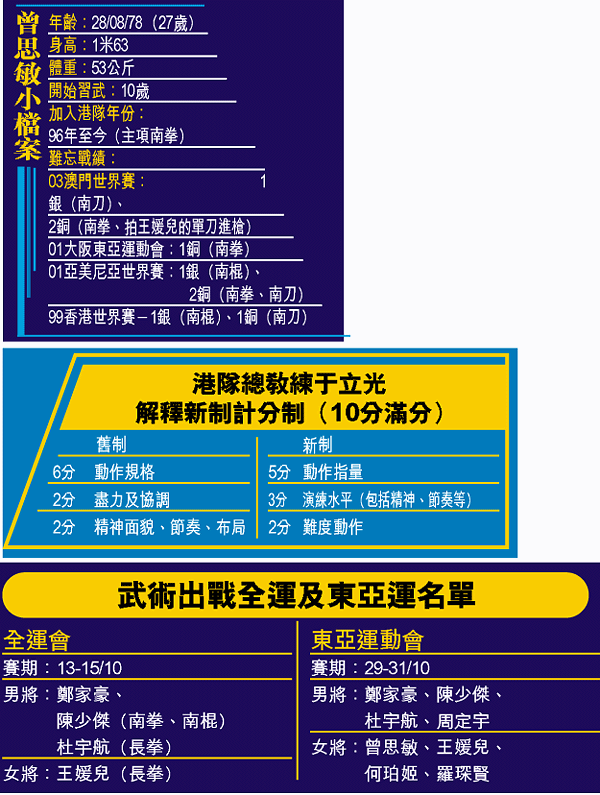 國際武聯自本年初改例,在以後的國際賽中,將原來的規定套路轉為自選套路,還加入新的難度(由以往空中一百八十度至三百六十度轉增加難度至五百四十度),本月底曾思敏有份參加的澳門東亞運,將是第一個嘗試新例的國際賽。