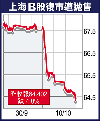 【本報訊】中國B股公司股權分置改革方案,千呼萬喚始出來。由於兩家試點公司的B股股東不獲賠償,昨日滬深股市在十一黃金周假期復市的首天全面下挫,滬深B股指數更創出7月18日以來最大單日跌幅,分別收64.402及214.232,跌4.8%及4.17%。