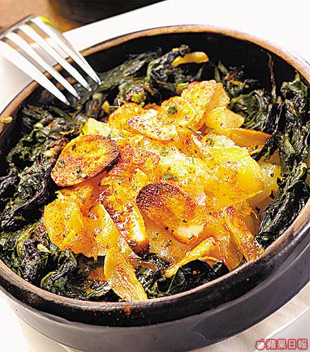 入口先是馬介休的鹹香,接着是半溶兼帶羶香的羊奶芝士,然後是腍身的菠菜,最正是那片香脆惹味的蒜片,口感豐富,記者最愛。
