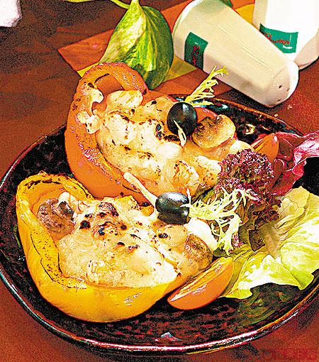 炒香白菌粒、洋葱粒及蝦,加忌廉汁後放入刮空的紅、黃椒內,面鋪芝士然後拿去焗,半溶的芝士加忌廉汁夠香滑,最好餡料連黃?紅椒一併入口就不覺膩。