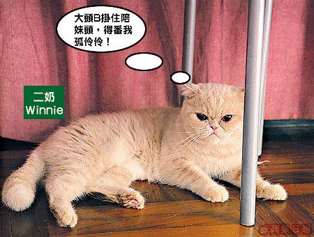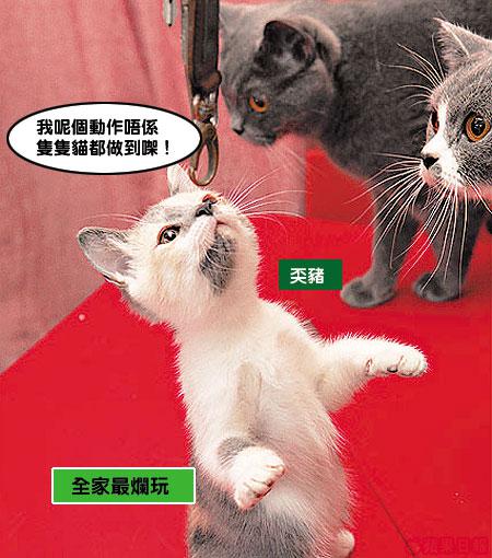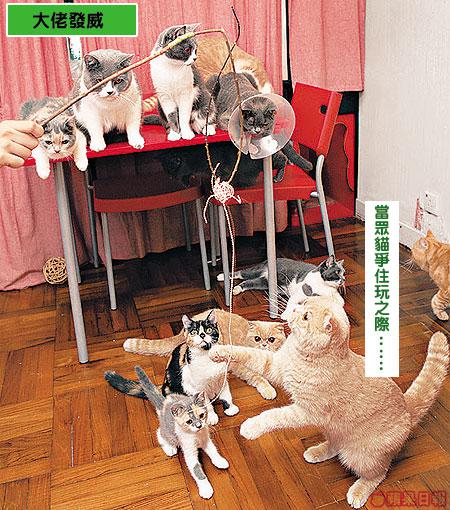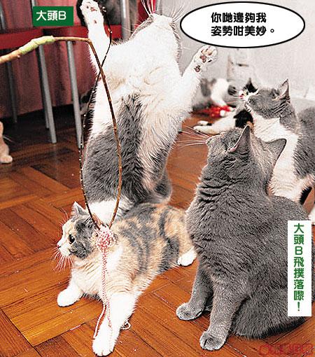 喺呢間屋見貓重多過見人,人貓比例係2對16,邊個至係呢間屋嘅主人?真係唔多清楚。「佢係我哋呢間屋嘅一家之主。」Erica指着大頭B說。喺呢個大家族中,以大頭B最得主人歡心。無他,單睇佢咁有台型就令人貓肅然起敬。主人話大頭B已有三歲,性格變得沉實穩重,愛靜靜坐喺一旁,睇住啲𡃁。不過,可能佢真係以為自己係一家之主,見到記者來訪,立刻熱情起來,表演多項高難度動作,睇到其他貓咪眼定定。