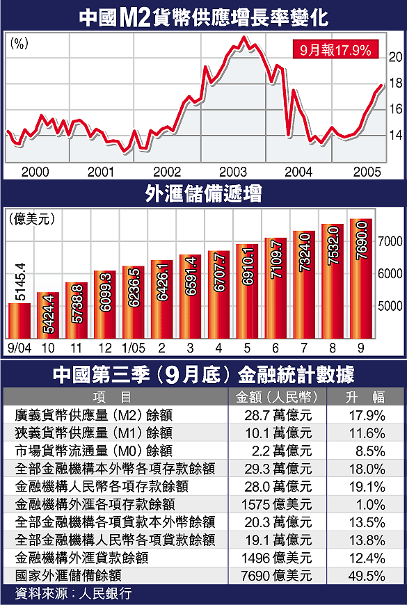 至於廣義貨幣供應量(M2),9月底餘額為28.7萬億元人民幣,較去年同期增長17.9%,較去年底高3.2個百分點,相對8月底則高0.6個百分點。人行指出,「M2增長速度明顯加快,增長幅度高於預期目標」。業界認為,M2增速加快反映通脹壓力上升,但為免觸動熱錢流入,相信當局不會隨便加息。