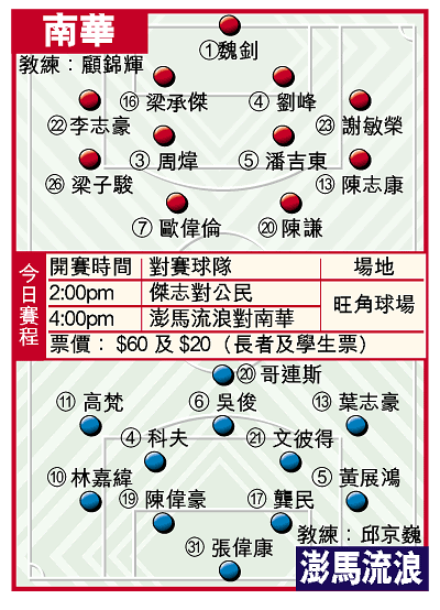 【本報訊】受傷兵及停賽困擾的南華,今午四時在旺角場上演的甲組聯賽,變陣出戰有前神射手哥連斯加盟的澎馬流浪,力圖終止連敗;而榜首傑志則在頭場面對積弱的公民,有力向五連勝進軍。