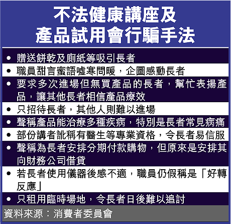 【本報訊】消費者委員會踢爆市面上不法的健康講座充滿誤導成份,既以甜言蜜語博取老人家的信任,又推銷聲稱「能醫百病」的按摩床等醫療產品,騙取長者「棺材本」。醫學界擔心,長者誤信產品而拒絕求診,會延誤病情,甚至有生命危險。消委會則要求港府盡快立法規管醫療儀器。 記者:翁煜雄