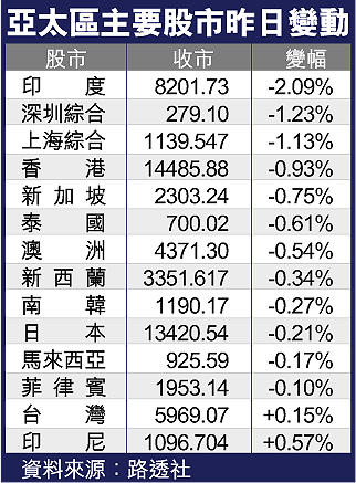 日本日經平均指數連跌3日,昨下滑28.70(0.21%),降至13420.54(見表),因為投資者認為當地金融股股價偏高,故趁高出貨套利。印度股市表現最劣,SENSEX30指數下滑175.17(2.09%),挫見8201.73。